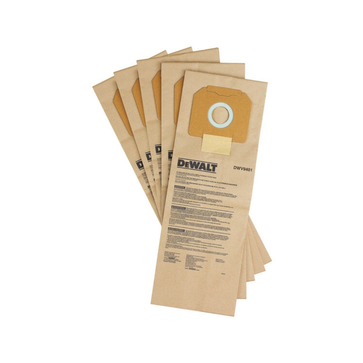 Τεχνικά Χαρακτηριστικά: • Τύπος: Σακούλες συλλογής σκόνης (disposable dust bags) • Μάρκα: DeWalt • Κωδικός: DWV9401-XJ • Ποσότητα: 5 τεμάχια ανά συσκευασία • Κατάλληλες για μοντέλα: D27901L, DWV901L, DWV902L, DWV902M, DWV905M, DWV905H • Υλικό: Χαρτί υψηλής αντοχής για συλλογή σκόνης και αποφυγή επανακυκλοφορίας σωματιδίων • Χρήση: Ανταλλακτικό εξάρτημα για εξαγωγείς σκόνης, διευκολύνει τη συντήρηση και διατήρηση της απόδοσης απορρόφησης.