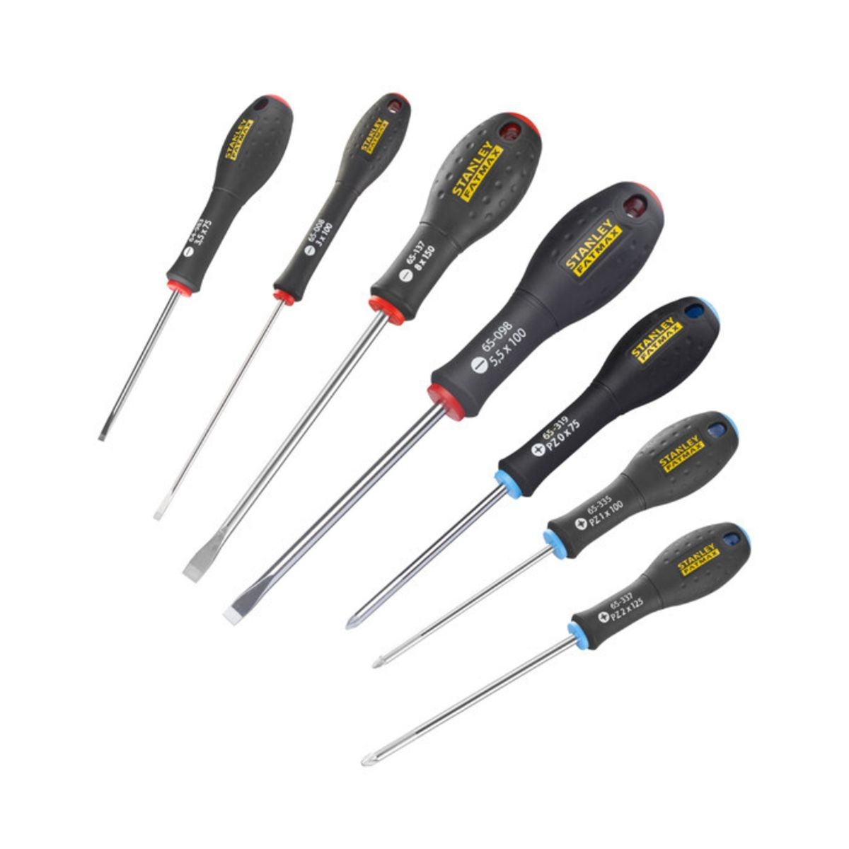 Τεχνικά Χαρακτηριστικά: • Σετ 7 τεμαχίων • Λεπίδες από χρωμιο-βαναδίου για υψηλή αντοχή • Εργονομικές λαβές Soft-Grip με χρωματική κωδικοποίηση • Περιλαμβάνει τύπους: – PZ0 × 75 mm, PZ1 × 100 mm, PZ2 × 125 mm – SL 3,0 × 100 mm, SL 3,5 × 75 mm – Flared 5,5 × 100 mm, Flared 8 × 150 mm • Ιδανικό για επαγγελματική χρήση σε ξύλο και μεταλλικές εφαρμογές