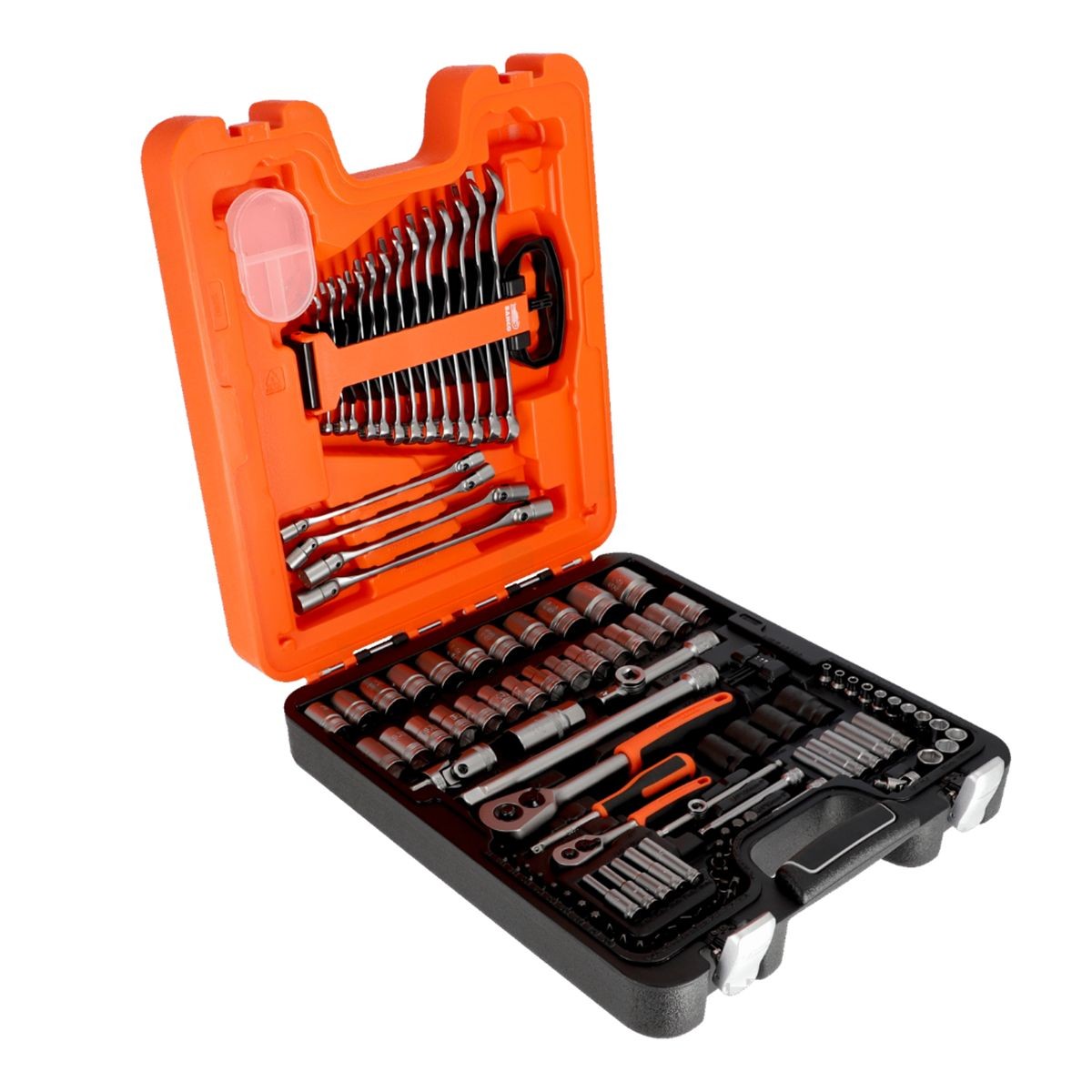 Το Bahco S108 είναι ένα ολοκληρωμένο σετ καρυδάκιας – καστάνιας 108 τεμαχίων, σχεδιασμένο για επαγγελματίες και απαιτητικούς ερασιτέχνες. Περιλαμβάνει καρυδάκια ¼″ και ½″, κλειδιά, bits, προεκτάσεις και αντάπτορες, καλύπτοντας κάθε είδους εργασία συντήρησης ή επισκευής. Όλα τα εξαρτήματα είναι κατασκευασμένα από χάλυβα χρωμίου-βαναδίου υψηλής αντοχής, με φινίρισμα ματ χρωμίου για μέγιστη αντοχή στη διάβρωση.