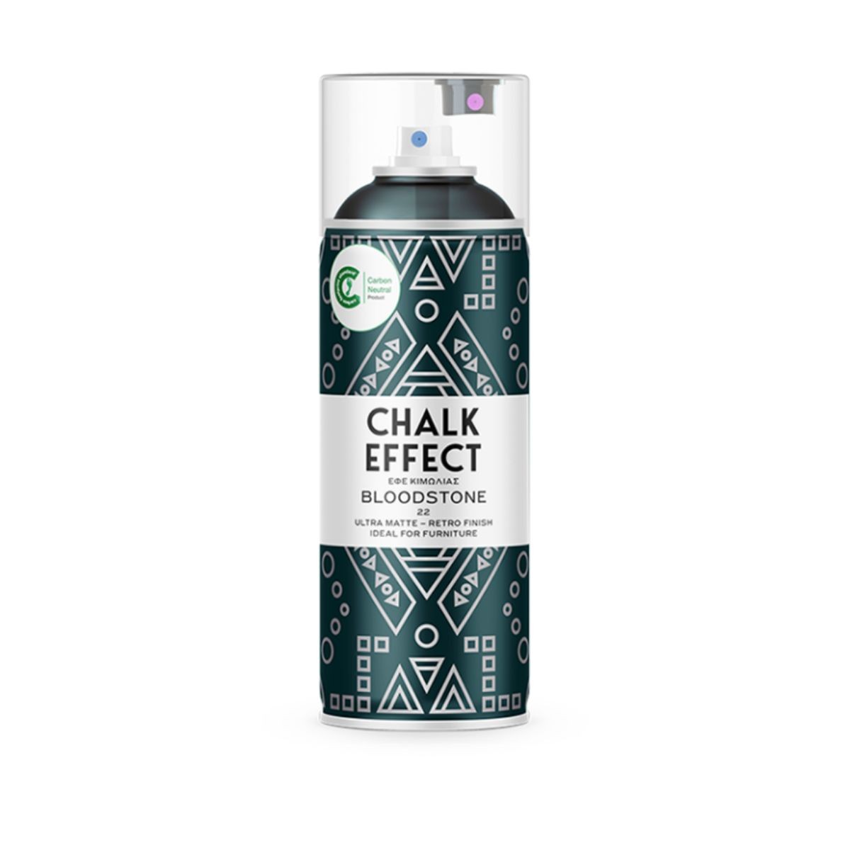 Chalk Effect N22 – Bloodstone, το πρώτο παγκοσμίως ματ σπρέι ουδέτερου αποτυπώματος άνθρακα. Ανανεώστε τα παλιά σας έπιπλα και διακοσμητικά αντικείμενα δίνοντάς τους ένα εντυπωσιακό ματ φινίρισμα κιμωλίας με τον πιο εύκολο και δημιουργικό τρόπο. Ιδανικό για έπιπλα και διακοσμητικά αντικείμενα. Έχει πρόσφυση σε ξύλο, μελαμίνη, καμβά, μέταλλο, γυαλί και χαρτόνι. Κατάλληλο για DIY εφαρμογές αλλά και για επαγγελματίες. Περιλαμβάνει δύο (2) μπεκ ψεκασμού για μικρές και μεγαλύτερες επιφάνειες. Δεν στάζει, ενώ ο ειδικός ψεκασμός του CHALK EFFECT ελαχιστοποιεί το χρόνο βαφής. Δώστε νέα ζωή στα παλιά σας έπιπλα, σε 15 λεπτά, χωρίς εργαλεία και ειδικές γνώσεις.