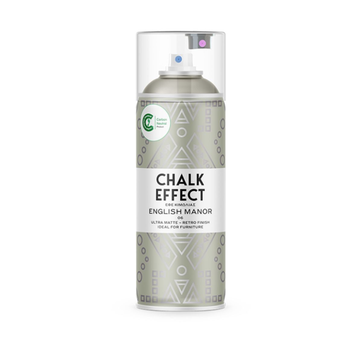 Chalk Effect N06 – English Manor, το πρώτο παγκοσμίως ματ σπρέι ουδέτερου αποτυπώματος άνθρακα. Ανανεώστε τα παλιά σας έπιπλα και διακοσμητικά αντικείμενα δίνοντάς τους ένα εντυπωσιακό ματ φινίρισμα κιμωλίας με τον πιο εύκολο και δημιουργικό τρόπο. Ιδανικό για έπιπλα και διακοσμητικά αντικείμενα. Έχει πρόσφυση σε ξύλο, μελαμίνη, καμβά, μέταλλο, γυαλί και χαρτόνι. Κατάλληλο για DIY εφαρμογές αλλά και για επαγγελματίες. Περιλαμβάνει δύο (2) μπεκ ψεκασμού για μικρές και μεγαλύτερες επιφάνειες. Δεν στάζει, ενώ ο ειδικός ψεκασμός του CHALK EFFECT ελαχιστοποιεί το χρόνο βαφής. Δώστε νέα ζωή στα παλιά σας έπιπλα, σε 15 λεπτά, χωρίς εργαλεία και ειδικές γνώσεις.
