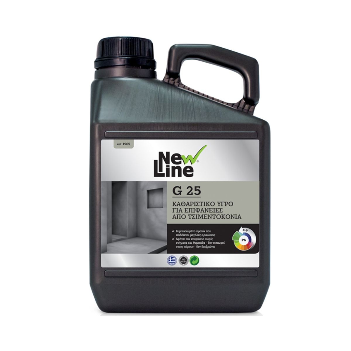 Το New Line G 25 είναι ειδικό καθαριστικό υγρό για επιφάνειες από τσιμεντοκονία, κατάλληλο για αποτελεσματικό καθαρισμό μεγάλων επιφανειών. Αφαιρεί ρύπους, επικαθίσεις και ανόργανα υπολείμματα χωρίς να αλλοιώνει τη δομή της επιφάνειας, συμβάλλοντας στη σωστή συντήρηση και την επαναφορά της καθαρής όψης. Ιδανικό για επαγγελματική και εντατική χρήση σε εσωτερικούς και εξωτερικούς χώρους.